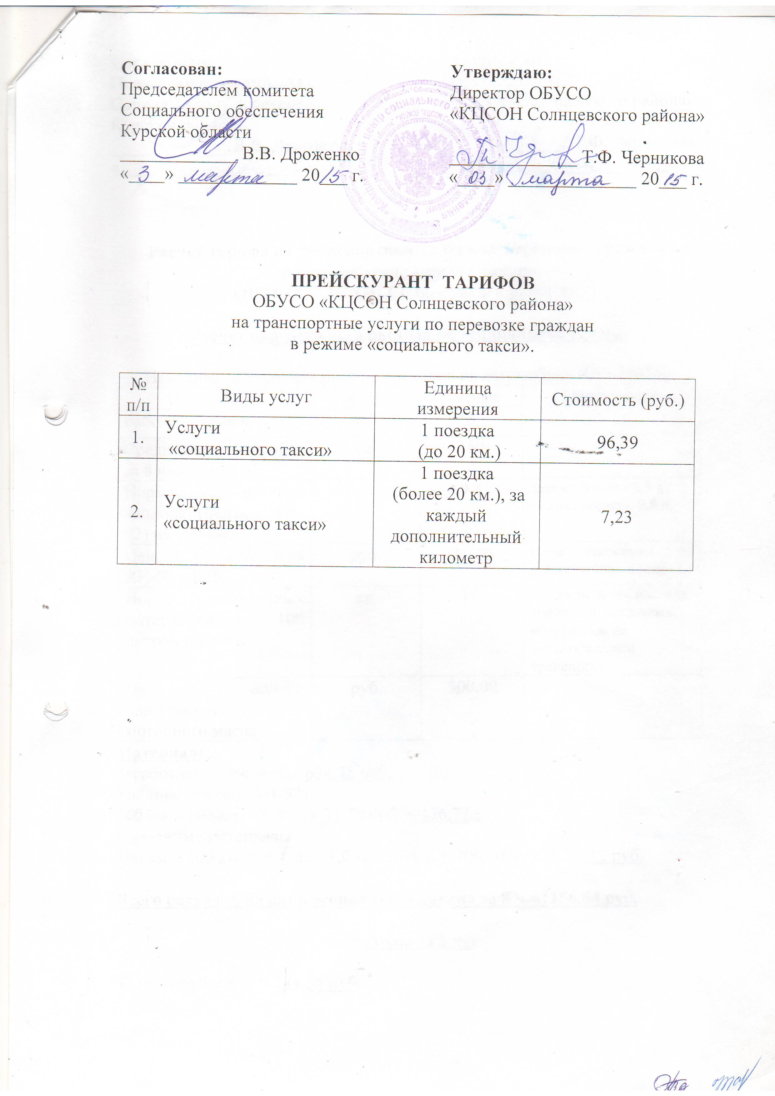 Прейскурант тарифов