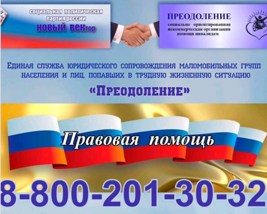 «Единая служба юридического сопровождения маломобильных групп населения и лиц, попавших в трудную жизненную ситуацию «Преодоление» принимает обращения по бесплатному телефону: 8-800-201-30-32.