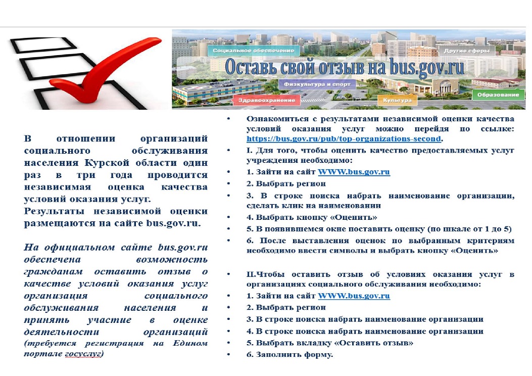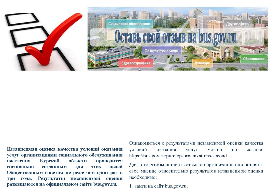 На официальном сайте bus.gov.ru Вы можете оставить свои отзывы, пожелания, предложения и оценку о работе ОБУСО «КЦСОН Солнцевского района», перейдя в свой личный кабинет на Госуслугах. Инструкция по переходу на сайт прилагается. Благодарим за участие.